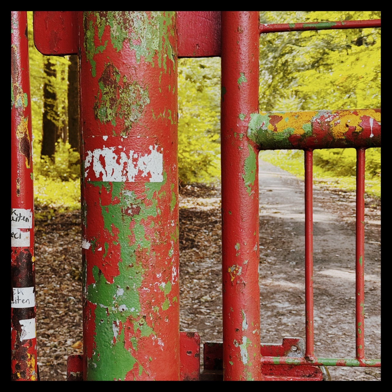 Een ijsje later stapte ik weer op en kwam bij het rode hek van het Reichswald. Is het rood, dacht ik toen ik later de foto terugkeek, of toch groen of eigenlijk geel?