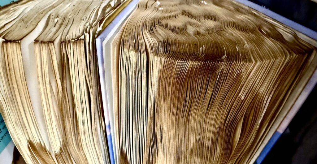 Toen ik het doorhad, zag ik het ook. De boeken bij de letter N waren slachtoffer van een lekkage in het pand geweest. Handdoeken lagen op de planken en achterwaarts stonden enkele titels te drogen.